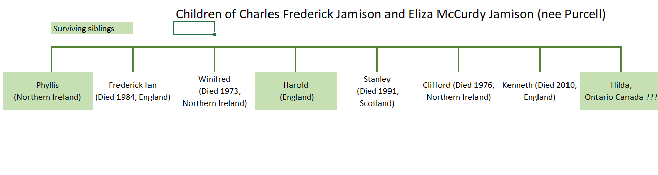 Below I’ve attached a link to a chart showing the children of Charles Frederick Jamison and Eliza McCurdy Jamison (nee Purcell), showing their current whereabouts, or when they died. Hilda is the last piece of the puzzle, and I hope that if we do trace her or her family makes contact, I can shade her name in green on my chart to show she is still with us.