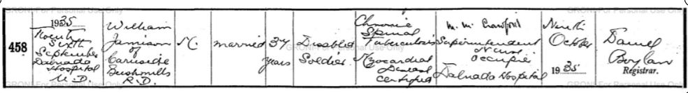Cause of death for William Jr is noted as “Chronic Spinal Tuberculosis”, which confirms family stories I have heard that William had a disability that required him to wear a back brace; this is further confirmed by William’s occupation being listed as “Disabled Soldier”. Another phrase follows the TB diagnosis but I’m unable to read it; please let me know if you can decipher it? The last word appears to be “certified”, which is repeated on William Senior’s death entry.